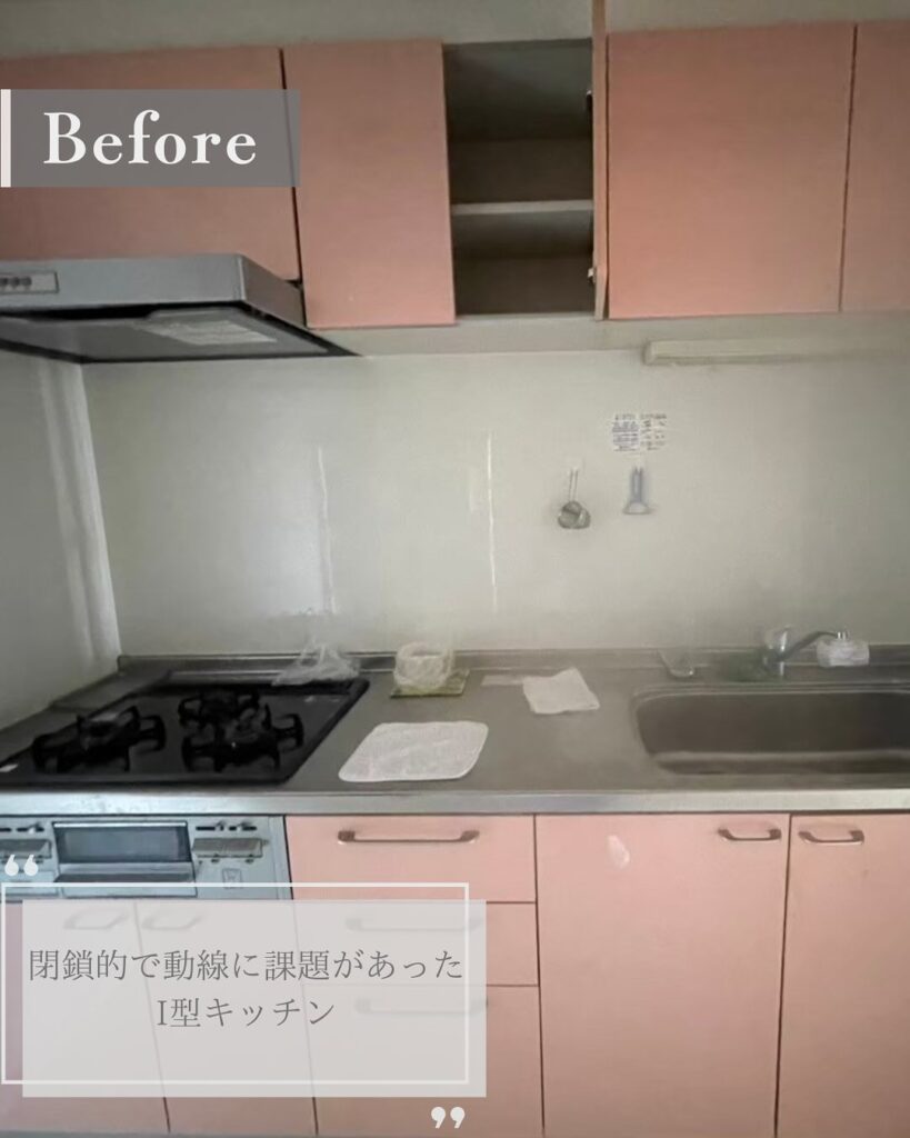 ピンクの扉が特徴的な既存のI型キッチンは、閉鎖的で動線にも課題がありました。料理をするにも窮屈で、効率的とは言えませんでした。